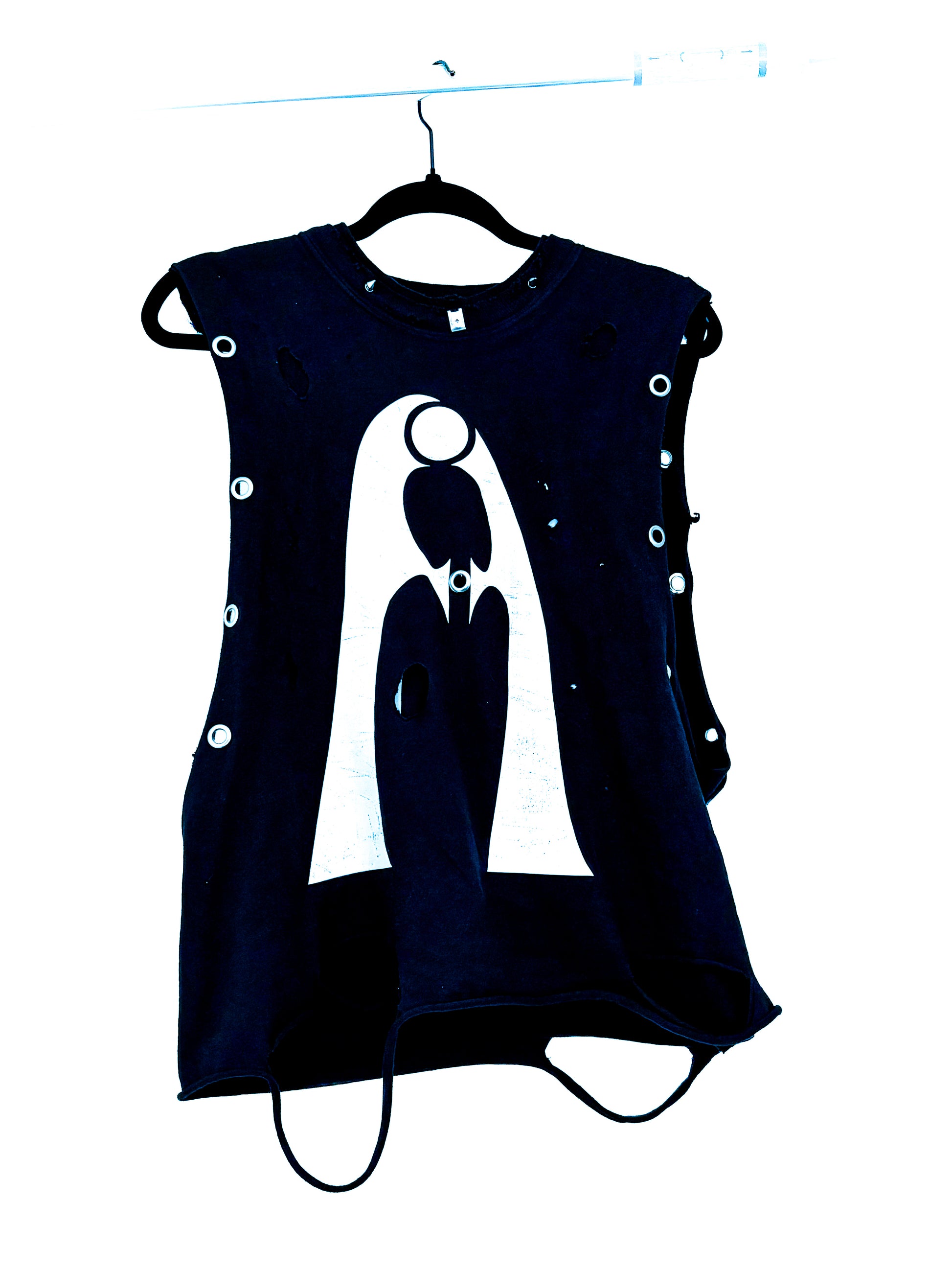 This double-layer cropped tank is the fully evolved form of the core tee. Stacked, slashed, and reformed. Featuring aggressive distressing, layered texture, and a collage of metal hardware, this piece pushes beyond basic. Raw hems and asymmetric stacking bring depth and chaos to the surface. For the ones ready to embrace controlled disorder.